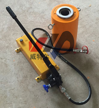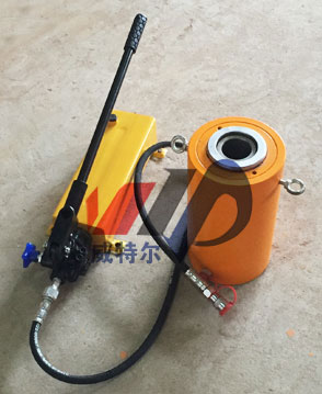 8、使用時先將手動泵的快速接頭與頂對接,然后選好位置,將油泵上的放油螺釘旋緊,即可工作。欲使活塞桿下降,將手動油泵手輪按逆時針方向微微旋松,油缸卸荷,活塞桿即逐漸下降。否則下降速度過快將產(chǎn)生危險。